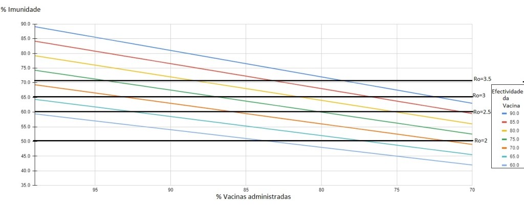 Contudo, se tivermos uma efetividade de vacina de apenas 70%, ou um Ro = 3, poderá não ser suficiente.