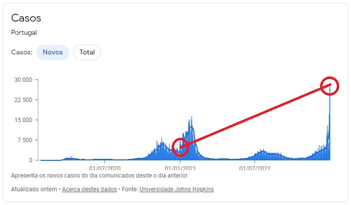 O início de 2021 foi marcado pela rápida ascensão da 3ª vaga (ou, como apontam alguns especialistas, resurgimento da 2ª) durante o mês de janeiro e pela diminuição de casos em fevereiro. A 4ª vaga surgiu em julho e a 5ª começou em novembro. O impacto do surgimento da variante Ómicron é patente na segunda quinzena do mês de dezembro. Temos, atualmente, cerca de 4 vezes mais casos do que há um ano.
