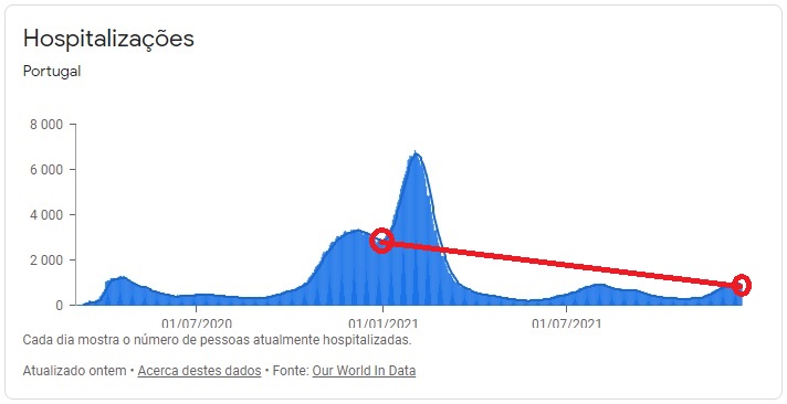 A evolução das hospitalizações acompanhou a progressão do número de casos. Em janeiro atingiu o número crítico máximo de 6680 (média de 7 dias) pessoas internadas. Contudo, desde a segunda quinzena de março nunca superou o máximo de hospitalizações da 1ª vaga (média a 7 dias de: 1242) ficando sempre abaixo de 1000 pessoas internadas. Temos, atualmente, cerca de 3 vezes menos hospitalizações do que há um ano.