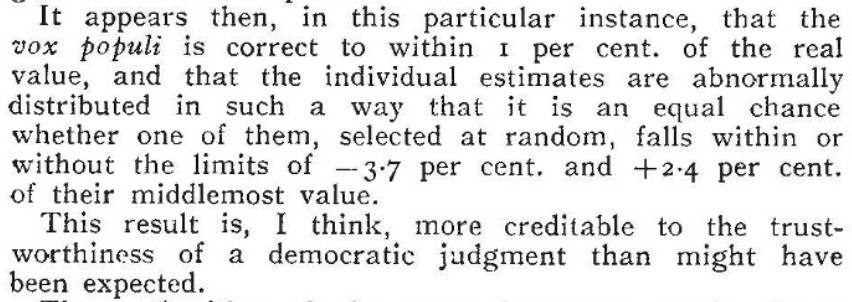 Francis Galton, conhecido pelo seu ceticismo em relação à capacidade intelectual das massas, analisou as 787 estimativas sobre o peso do boi abatido, e descobriu que a média das respostas (1197 libras) diferia apenas uma libra do peso real (1198 libras). Este resultado, publicado na revista Nature (Galton, 1907. Vox Populi. Nature.), contradiz as suas próprias convicções elitistas, revelando que a agregação de opiniões diversificadas, incluindo as de leigos, pode produzir precisão estatística.
